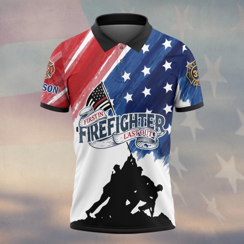 The First In Last Out firefighter polo shirt stands out not just for its bold colors, but for the story it tells. The vibrant red and blue brush strokes evoke a sense of urgency and valor, while the classic stars and stripes remind us of the American spirit. The black silhouette of a firefighter not only enhances the design but symbolizes the strength and courage of first responders. Each element is thoughtfully placed, making this shirt not just an article of clothing, but a statement piece that resonates with pride and honor.